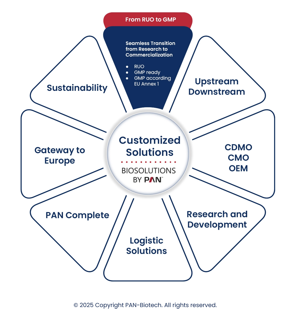 The development of new therapeutic applications requires extensive research. At PAN you can choose from more than 1,800 catalogue products in RUO quality, including a wide variety of culture media, reagents and buffer solutions. We have 85 % of our portfolio in stock and ready to deliver within 1-2 days.